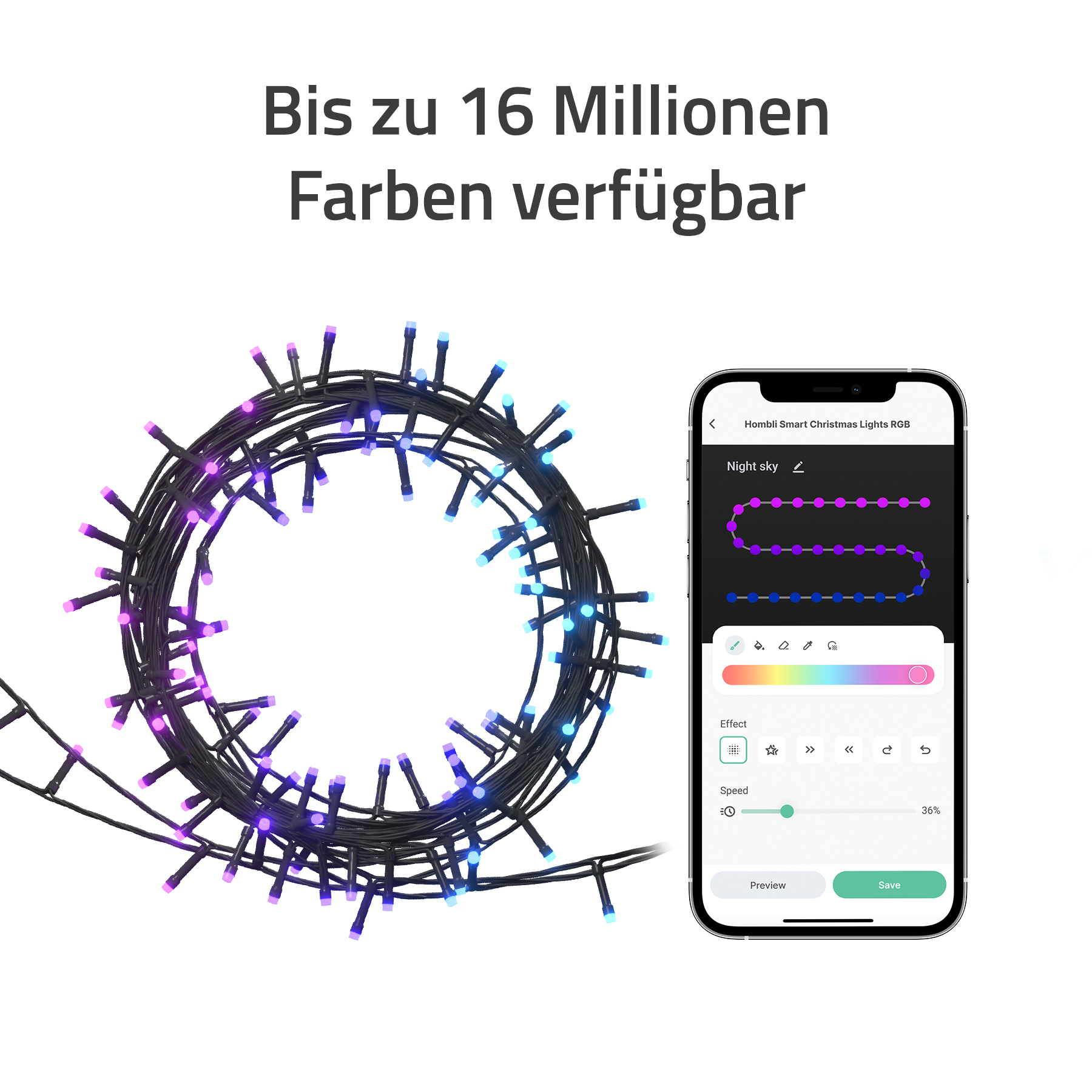 Das Verwalten Ihrer Weihnachtsbeleuchtung war noch nie so einfach. Mit der Hombli-App können Sie jede Funktion der Lichter von Ihrem Smartphone aus steuern. Ändern Sie die Farben, passen Sie die Helligkeit an, stellen Sie Zeitpläne ein und entwerfen Sie sogar Ihre eigenen Lichteffekte alles mit nur ein paar Klicks.