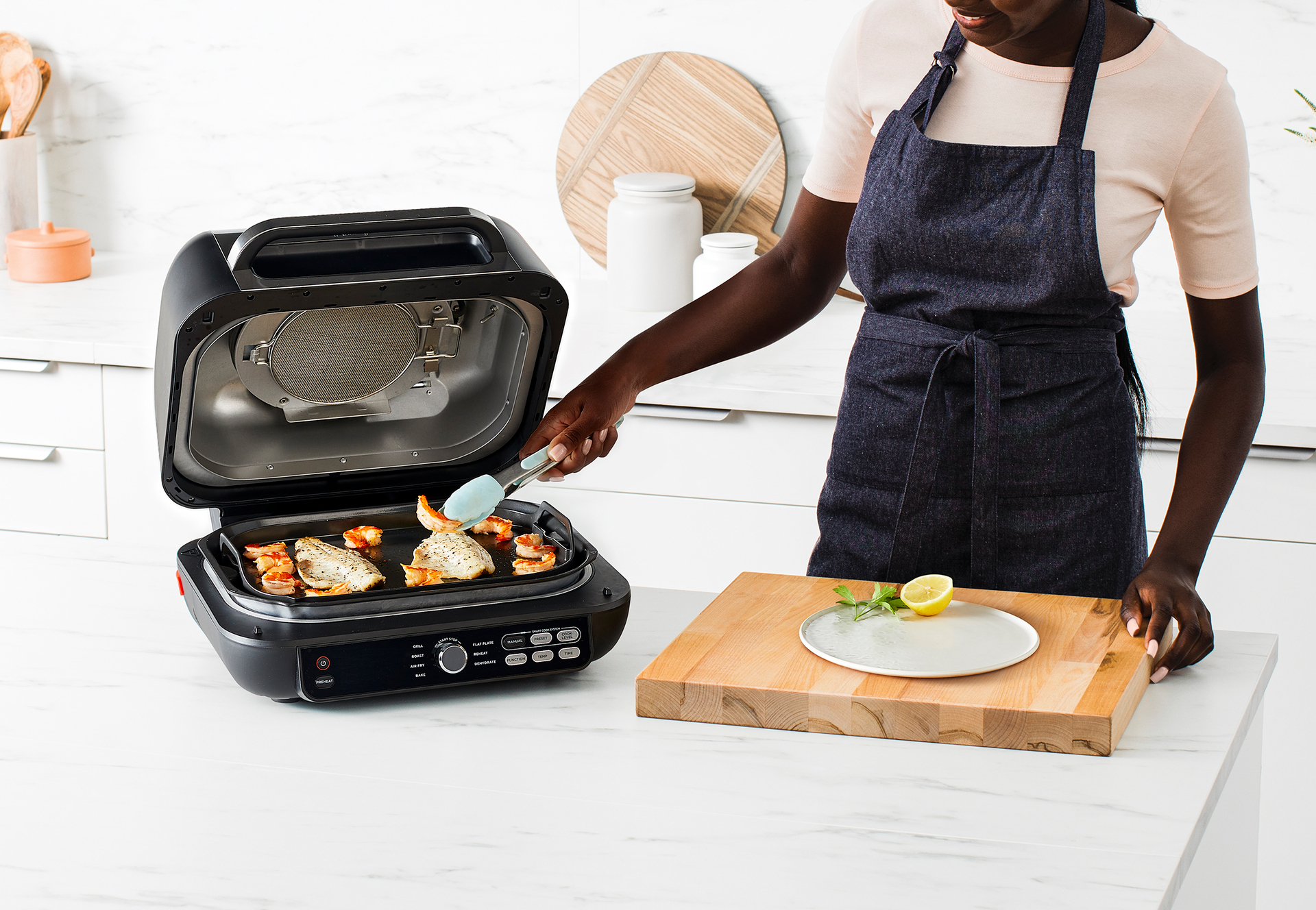 Entdecken Sie neue kulinarische Möglichkeiten. Scharfes Anbraten bei hoher Hitze schließt das Aroma ein und erzielt bessere Grillergebnisse. Wählen Sie die jeweils passende Grillplatte – die elektrische Grillplatte, um saftige Steaks, Halloumi-Spieße und vieles mehr mit dem authentischen Grillmuster zu grillen, und die Plancha, um zarte Speisen wie Meeresfrüchte und Fajitas scharf anzubraten. Bereiten Sie Ihre Speisen mit offenem oder geschlossenem Deckel zu.