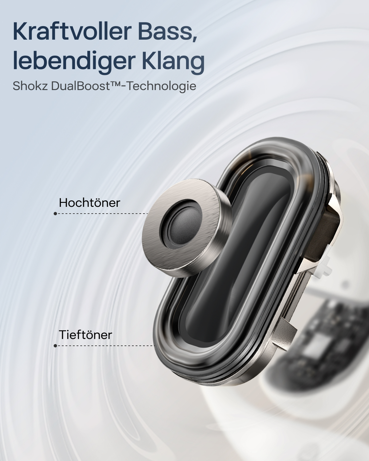 - Shokz OpenBass 2.0-Algorithmus - liefert kraftvolle Bässe, die präzise auf Ihren Gehörgang ausgerichtet sind