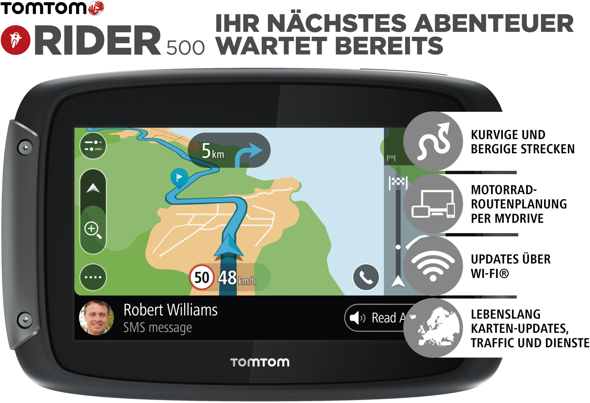 Entdecken Sie die spannendsten, exklusiven neuen Routen mit dem aktuellsten TomTom Rider 500 Europe mit Wi-Fi.